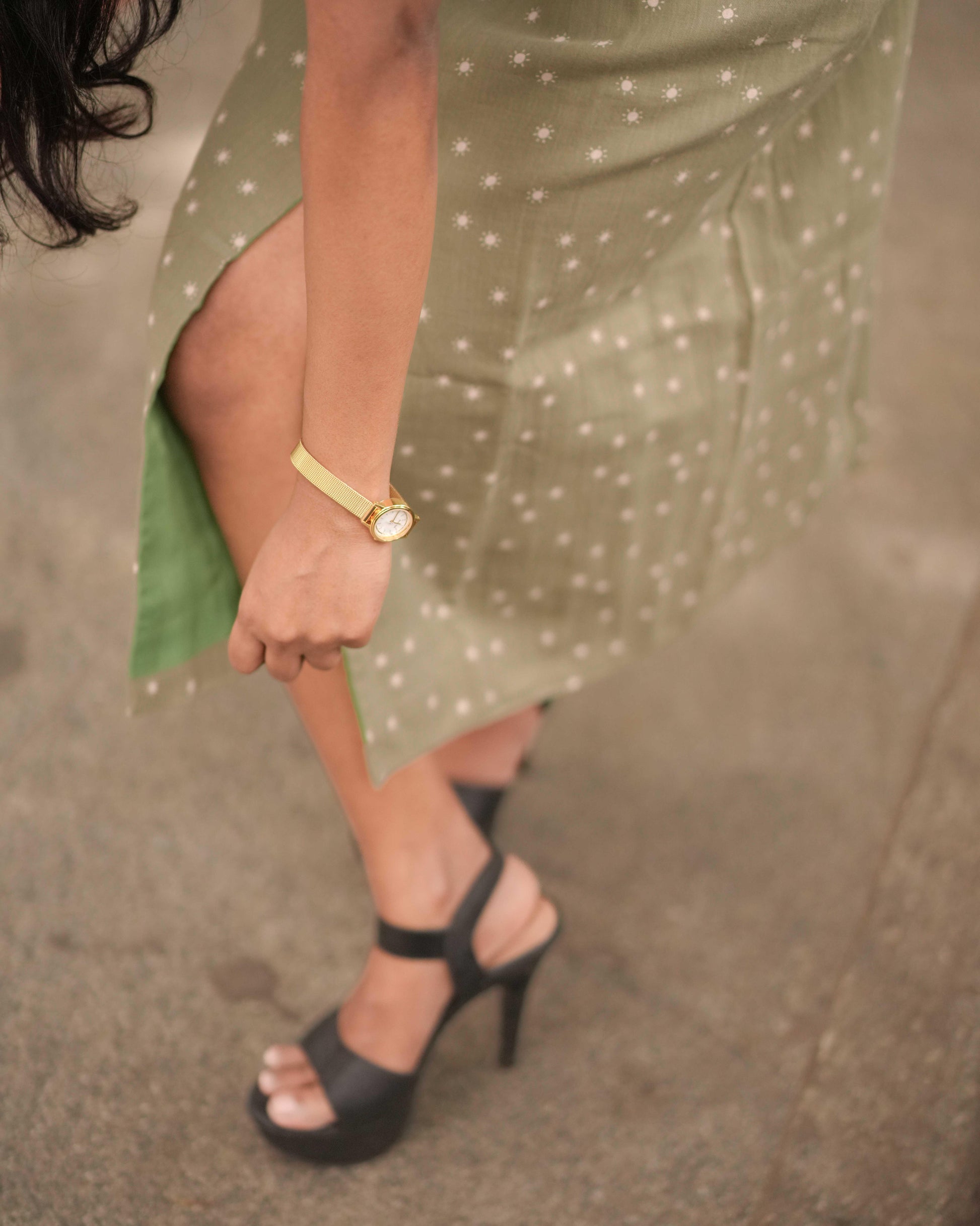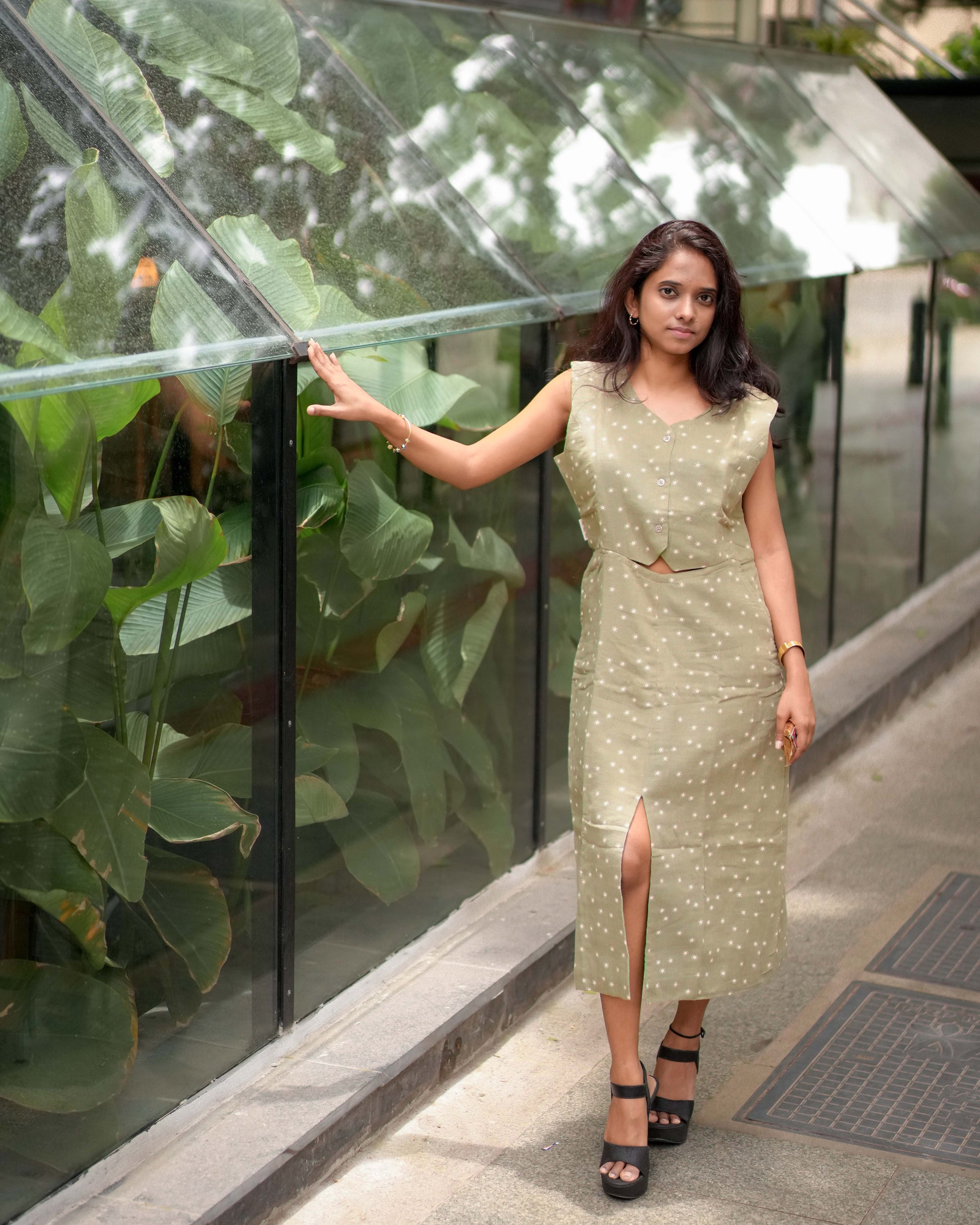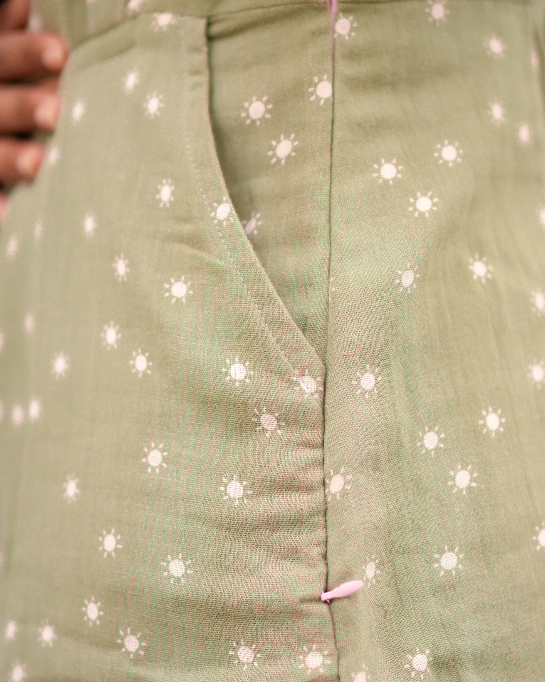 Add a pop of pastel colour to your wardrobe using KIZ's stunning green jumpsuit dress, crafted from 100% cotton baby soft muslin fabric. The soft, breathable fabric provides a comfortable all day fit, the knee-length design with a stylish slit on waist-portion & a long slit on bottom adds a touch of elegance. Vest and skirt-inspired design, cleverly crafted as a single-piece jumpsuit with small sun prints, adding a playful touch.
